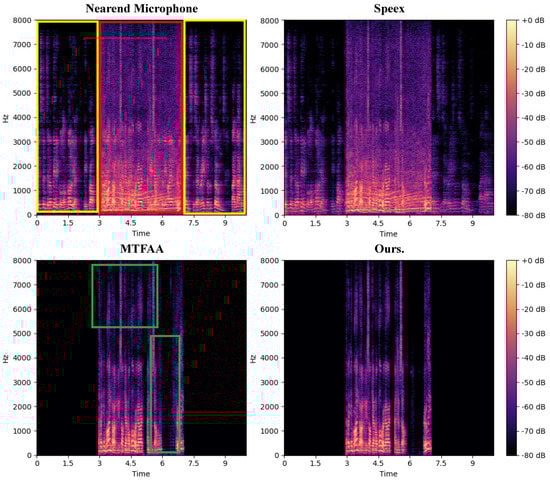 To provide a more visual representation of the acoustic echo cancellation performance of our model, Figure 7 illustrates the comparison results of the speech spectrogram before and after processing. The yellow box includes the echo and noise that need to be removed, and the red box includes echo, noise, and reverberation. It is evident from the spectrogram comparison that the echo has been partially canceled after the Speex processing. On the other hand, after the MTFAA processing, the echo, noise and reverberation are obviously canceled, and there is hardly any visible echo before and after the near-end speech. Remarkably, the processing of our model achieves an even better acoustic echo cancellation and noise and reverberation suppression performance compared to MTFAA, which is shown in the green box.