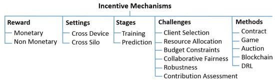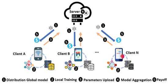 Game theory involves strategic interactions between rational participants. The goal is to determine the optimal strategy for a client’s payoff in relation to other clients’ strategies. The Stackelberg game is a game theoretic model with interaction between a leader (server) and follower (client) [35]. The central server gives a set of rules for participants to devise optimal strategies. This iterates until reaching the Nash equilibrium, where no player can improve its payoff by changing their strategy. However, this method is inefficient amid information asymmetry, undesirable behaviors, and non-i.i.d. data to incorporate multiple factors to design incentive schemes.