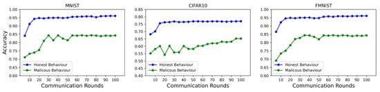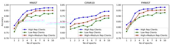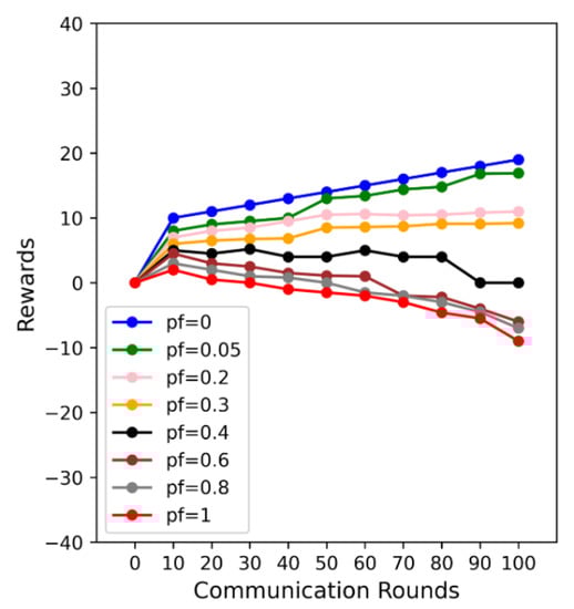 The robustness of FRIMFL in fair reward distribution is shown in Figure 10. The x axis represents communication iterations and the y axis represents participants’ cumulative incentive, where pf is the proportion of data owners’ unreliable (poison-flip) data. The reward values vary with different pf values. Reputed clients with quality data (low pf) are considered collaborators and thus receive rewards. This shows that rewards are positively related to quality and contributions. Clients with malicious data (high pf) who have malicious interactions (bad reputation) are considered to be negative participants and hence punished by the server for obtaining rewards.