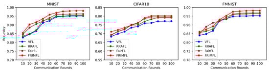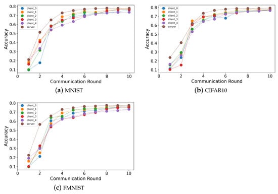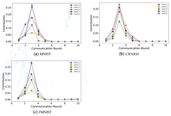 Figure 9 shows the individual contribution level by five data owners in each training round for all three datasets. Initially, the contributions were different for all clients. At training round 3, the highest contributions were observed. Client 0 appears to be the highest in all three datasets, whereas clients 3 and 4 contributed the least. Similar influence by participants in later training rounds demonstrates that FRIMFL promotes early contributions by all data owners.