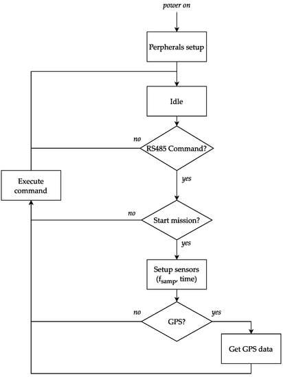 Firstly, after the node is powered for the first time, internal peripherals are set according to the latest parameters sent by the master unit, such as sampling frequency and mission time. After this initial state, the node passes to the idle state, where it waits for a command to be received from the master unit: commands include basic operations involving data sampling, internal memory control, and mission execution. A single mission is the entire time window where data are sampled and processed. Therefore, if a command containing a mission starting request is received by the node, it sets the internal accelerometers with incoming parameters, which are the actual sampling frequency and mission length, and checks for the GPS signals: if a GPS fix is detected, the node links to the satellite and obtains GPS data, such as its geological position (latitude and longitude) and temporal data (year, month, day, hour), and then uses the PPS signal to accurately synchronize the start of the acquisition with the other elements in the network; on the contrary, if no GPS fix is detected, node position remains undetermined for the master system during the execution of the command, and the synchronization loses some accuracy. A graphical representation of this workflow is reported in Figure 3.