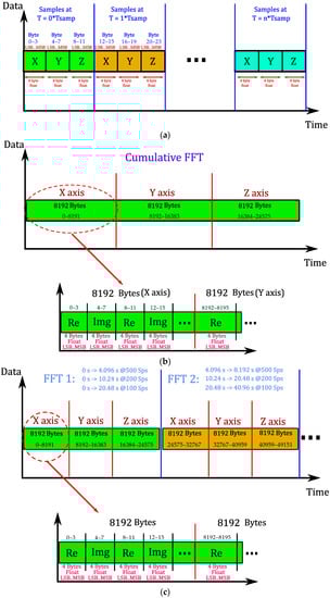 The master unit can retrieve several types of data from nodes after a mission, depending on the requested function. The first typology of available data is the raw acceleration throughout the mission (both from ADXL355 and ADXL345). The master can request up to 2048 bytes of payload per packet, formatted as represented in Figure 4a. A second data typology is the cumulative FFT, where FFT is calculated over a temporal average of accelerometric data sampled during the mission. The packet sent consists of a fixed 24.5 kB length equally distributed over 8.2 kB of FFT data for each axis. A single 8.2 kB data chunk, for each spatial axis, is composed of an 8 bytes repetitive sequence. Each sequence is composed in turn by FFT real part for the first 4 bytes and FFT imaginary part for the last 4 bytes. The structure of this packet is reported in Figure 4b.
