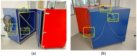 The disposition of the nodes with respect to the structure is also visible. Five nodes were used, four of which were placed on the outer sides of the box, the last one placed inside. The main reason for this choice is the non-overlapping of nodal points in order to detect a response as complete as possible. The aim of this setup is to verify the capability of the sensor network to coherently detect a modification in the evaluated structure. This is achieved by comparing the data acquired from each node.