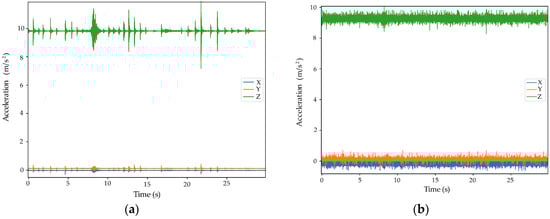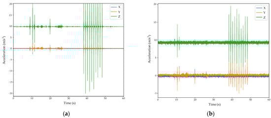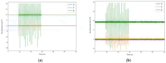 Results from the first test are reported in Figure 7a,b. It is noticeable how the main accelerometer could detect the minimal indirect structure perturbations, e.g., the passage of pedestrians and vehicles in an on-field application, differently from the backup accelerometer, where these stimuli are buried in noise.