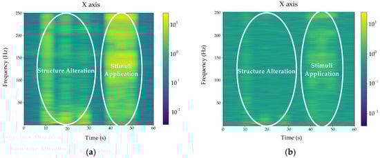 Spectrograms before (a) and after (b) structural alteration retrieved from the Z axis results on node 3.
