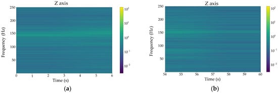 Spectrograms of the primary (a) and secondary (b) sensors from node 5 related to the third test.