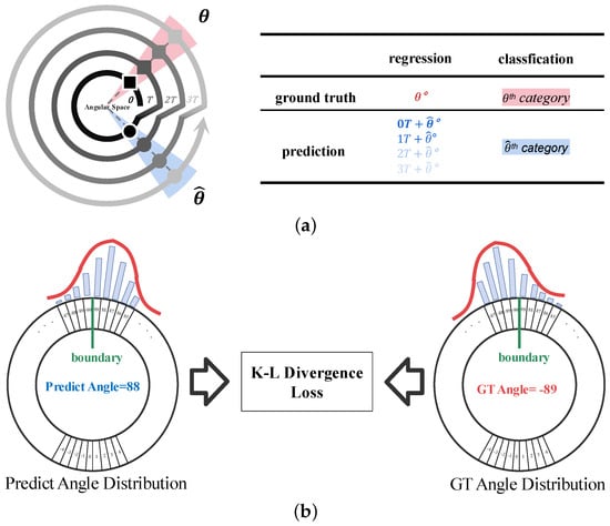 In this section, we present our approach. First, we adopt the discrete circular Gaussian distribution spanning a single minimal positive period as the ground truth of the angle. The circularization of Gaussians solves the boundary problem and discretization avoids the multi-valued problem. For instance, an original label of the angle can be used to generate a circular Gaussian distribution in , as shown in Figure 1b. The loss of accuracy in the rotation detection task is minimal despite the conversion from continuous angle to discrete angle, just like the analysis in CLS [15]. Next, the Gaussian distribution of the angle can be represented as a multi-dimensional vector , with the l-th dimension as follows: