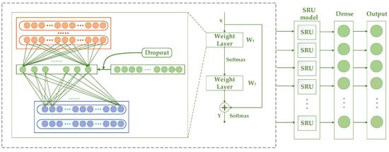 - First, a time series is generated for the input data so that the input data become sequence data with a time step. After the time series traffic is generated, we set the learning rate attenuation to control the learning rate in segments, in order to achieve more efficient learning at different stages and train the neural network. We use small batches of random gradient descent for training. The output obtained by the SRU is passed through the fully connected layer. In order to prevent overfitting, a dropout layer is added. Finally, the classification is performed through the softmax layer.