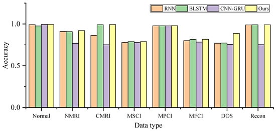 Experiments are performed on normal data and various types of attack data, as shown in Figure 5. The results show that the RNN algorithm has low accuracy for CMRI and DOS data, the BLSTM algorithm has low accuracy for DOS data, and the CNN-GRU algorithm has low accuracy for NMRI, CMRI, DOS and Recon data. Compared with other algorithms, our method has better performance on all kinds of data in the gas pipeline dataset, and the accuracy of DOS data is significantly higher than other algorithms.