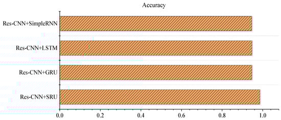 In Figure 6, SRU has the highest accuracy of the methods. In Figure 7, the training time of SRU is significantly shorter than that of LSTM and GRU. SimpleRNN has the least training time because of its simplest internal structure. However, SimpleRNN is prone to gradient disappearance and gradient explosion. It can be seen from the above results that the accuracy of SRU is the highest among the models, and the training time is shorter than LSTM and GRU.