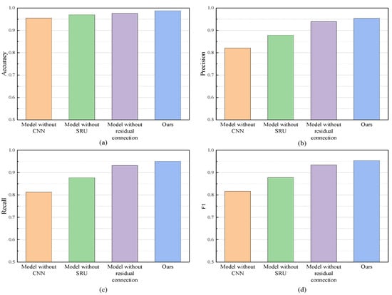 The results of the ablation study are shown in Figure 8. This proves that whatever components are removed from the model, the final accuracy, precision recall and F1 will decline. Among them, the accuracy of the model based on Res-CNN-SRU is 0.9879, the precision is 0.9534, the recall is 0.9504, and the F1 is 0.9519. If there is no CNN, the accuracy rate is obviously lagging behind and becomes the worst result. After deleting the SRU or residual connection part, all performance indicators also decreased. This shows that the use of CNN can effectively and automatically extract the features of industrial Internet network traffic and improve the accuracy of intrusion detection.