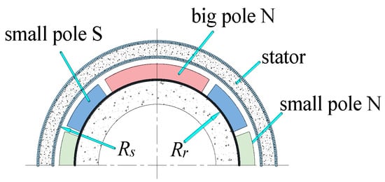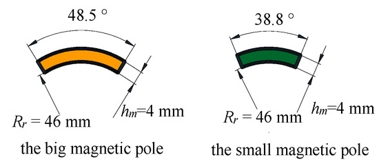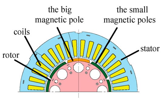 In this section, the 36-slots-8-poles motors of SMPMM-EPMS and SMPMM-UEPMS, which were both used in a practical project, are taken as examples to analyze and calculate the flux density using the SSM and FEM. The two-dimensional model of the SMPMM-UEPMS is shown in Figure 1. The structure and size of the big magnetic pole and small magnetic pole are shown in Figure 2. Meanwhile, the schematic model for the SMPMM-UEPMS and the SMPMM-EPMS are, respectively, shown in Figure 3 and Figure 4.