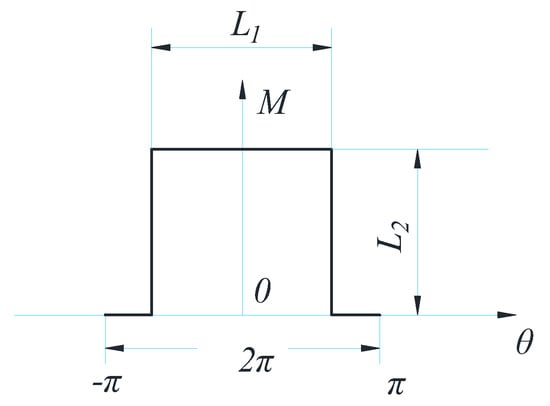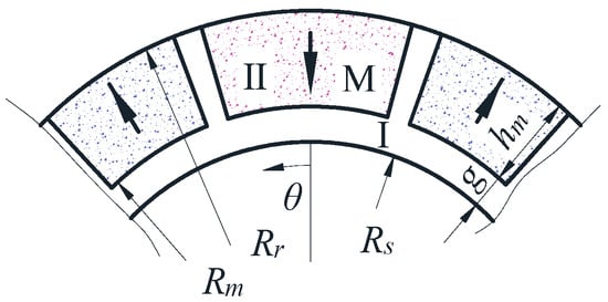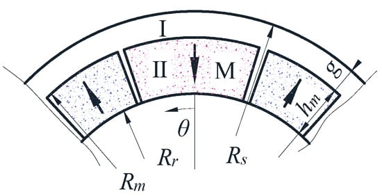 Rr represents the rotor radius, Rs represents the stator’s inner surface radius, and Rm represents the permanent magnet’s radius. hm represents the thickness of the PM. g represents the air gap length. The variable θ represents the mounting center angle of the magnet pole. Br represents the remanence, represents the ratio of the magnet pole-arc to pole-pitch, and represents the pole-pitch, where p represents the number of pole pairs. represents the magnetization vector, represents the relative recoil permeability, and represents the vacuum permeability. The L1 L2, the magnetic field strength vector, and the magnetic induction field intensity vector are constrained by the equations as follows:
