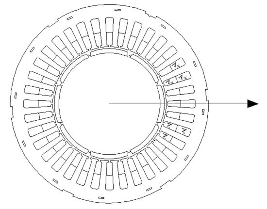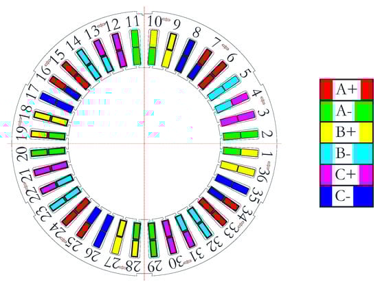 The stator winding distribution of the prototype in this paper is shown in Figure 8. The stator windings are divided into three phases, and each phase can be regarded as consisting of four groups of coils; each group has three turn coils and each coil consists of eleven conductors. One of the turn span angles of the coil is , and the other one is . The magnetic field generated by the single-phase winding can be regarded as the sum of the magnetic fields generated by each turn of the winding which makes up the phase. The magnetic field generated by each phase winding could be calculated as follows: