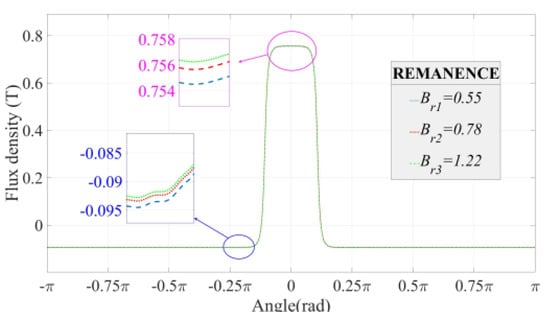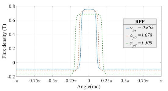 The RPP of the PM could be different, thus three groups of PMs with different RPPs, namely αp1, αp2, and αp3, were selected to calculate the radial magnetic density at the surface of the stator i.e., r = Rs; in this case, the remanence Br is 1.22. The calculation results are shown in Figure 11. Similarly, the remanence of the PMs can be different. Therefore, three groups of PMs with different remanence coefficients, namely Br1 = 0.55, Br2 = 0.78, and Br3 = 1.22, were taken into consideration for calculating the flux density in the air gap region; in this case, the RPP of the PMs were all 0.862. The calculation results are shown in Figure 12. Meanwhile, the key data of Figure 12 and Figure 13 are listed in Table 4.