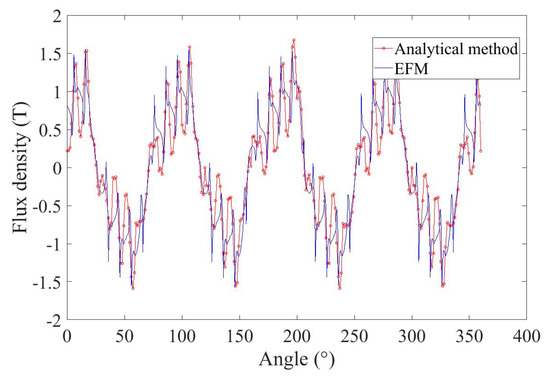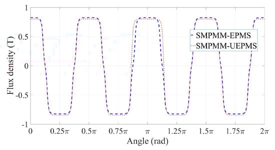 Comparing the curve of the SMPMM-EPMS with the curve of the SMPMM-UEPMS, the curve of the SMPMM-UEPMS shows an overall downward trend. This is due to the addition of PMs to the big pole increasing the whole area of the N-poles. Thus, this increases the magnetic flux flowing out of the N-poles. As the whole magnetic flux remains unchanged, i.e., the incoming magnetic flux is equal to the outgoing magnetic flux, this makes the magnetic flux flowing into the S-poles increase. While the area of the S-poles remains unchanged, the magnetic flux flowing into each S-pole increases. This makes the whole curve of the flux density of the SMPMM-UEPMS have a downward trend. For the curve of the SMPMM-EPMS, the maximum value of the flux density is 0.83, and the minimum value of the flux density is −0.83. Otherwise, for the curve of the SMPMM-UEPMS, the maximum value of the flux density is 0.80, and the minimum value of the flux density is −0.847.