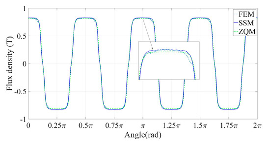 For the SMPMM-EPMS, three kinds of methods are used to calculate the radial component of the magnetic field distribution at the surface of the stator, i.e., the SSM, the ‘Z Q Zhu method (ZQM)’ in reference [20], and the FEM.