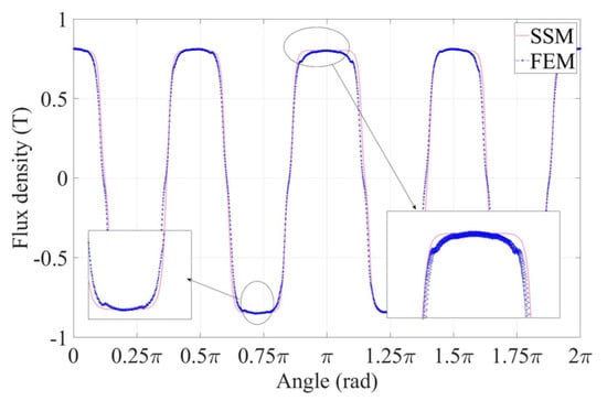 Figure 15 shows the results of the flux density of the SMPMM-EPMS, which was calculated using three methods. For the SSM curve, the maximum value of N-poles was 0.802, the minimum value of S-poles was −0.847, and for the FEM curve the maximum value for N-poles was 0.803, the minimum value for S-poles was −0.846, and the errors were 0.08% and 0.08%, respectively. The results of the three methods are almost identical. This indicates that the SSM can be used to analyze and calculate the magnetic flux density distribution at the surface of the stator. Nevertheless, for the SMPMM-UEPMS, only two methods are used to obtain the flux density, i.e., the SSM and the FEM. And the radial component results of the flux density calculated by the two methods are shown in Figure 16.