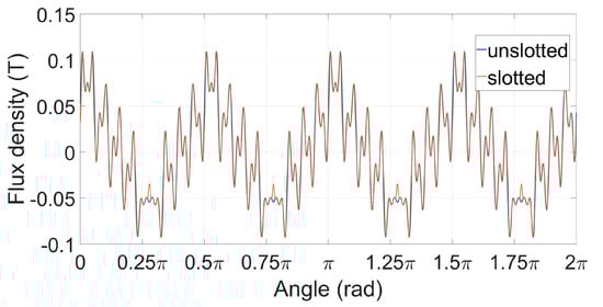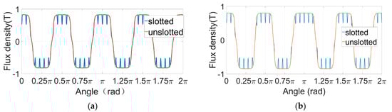 The effect of grooving on the magnetic field distribution generated by the PMs of the two types of motor: (a) SMPMM-EPMS and (b) SMPMM-UEPMS.