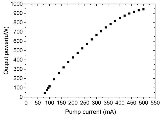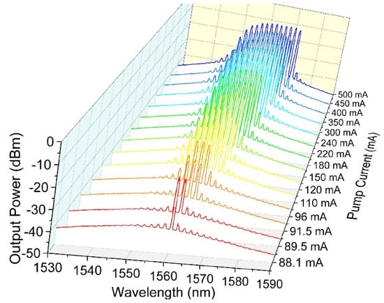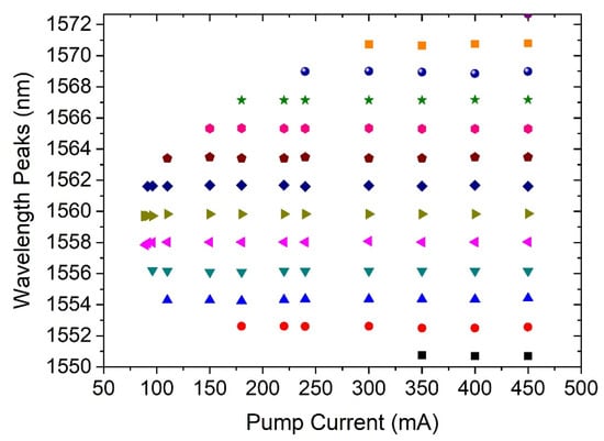 Moreover, we keep the pumping below the pumping current of 500 mA in our experiments to avoid any unstable generation of multiwavelength peaks shown in Figure 4. The SOA lasing threshold is about 70 mA. Then, increased linearly can be seen for up to 150 mA; after that, the output power increased exponentially due to SOA gain saturation at a high pump current. It is also observed that the gain medium of SOA effectively improves the stability of the multiwavelength lasing operation. Moreover, the double-ring structure of the proposed laser reshapes the transmission spectrum and generates lasing peaks with narrow channel spacing.