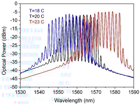 As SOA is polarization-dependent, the output spectra are tunable (Figure 5) either to the shorter wavelength by decreasing the temperature of the SOA device to 18 °C or the longer wavelength by increasing the SOA temperature to 23 °C and controlling the state of polarization in the laser cavity and loop mirror. SOA temperature is controlled using a TEC controller (thermoelectric/Peltier module) in the combined laser diode and TEC controllers. The TEC controller first determines the desired temperature setpoint and then applies the appropriate electric current needed to achieve the desired temperature.