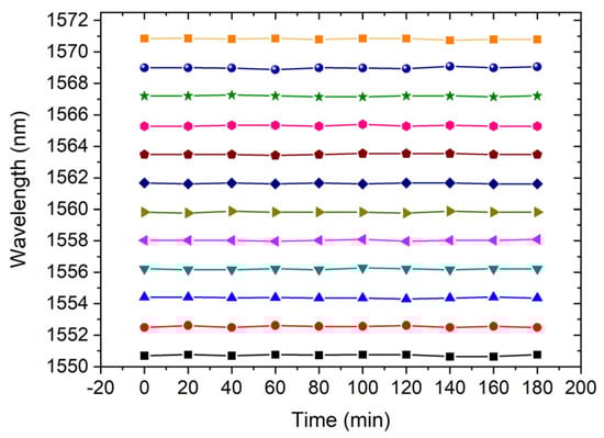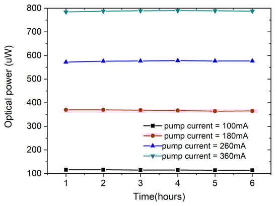 The stability of the output optical power and wavelength peaks are investigated to the time, as shown in Figure 6 and Figure 7, respectively. The optical power fluctuations of ~0.2 dB are observed after 6 h. Moreover, a shift of 0.059 nm in wavelength peaks is observed after 3 h with the pumping of 300 mA at room temperature. The SOA temperature is controlled by the received feedback from a temperature sensor; accordingly, there is a very small shift (0.059 nm) in wavelength peaks due to the temperature fluctuations in the device over the investigation time (3 h).