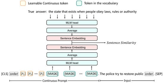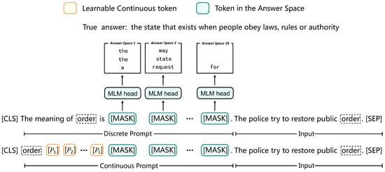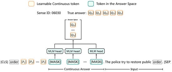 In our continuous answer method, the “sense” answer is , where , and is to map the class y to the set of label words for the j-th masked position . As we attempt to obtain the predictions of the masked tokens, the objective is similar to Equation (4):