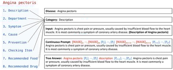 We also explore the effectiveness of the KLAPrompt method in the medical field. Firstly, we collect a disease and category prediction dataset (DCP) based on MedicalKG (https://github.com/zhihao-chen/QASystemOnMedicalKG accessed on 3 April 2023), which contains specific disease knowledge such as descriptions, departments, symptoms, causes, prevention, checking items, recommended foods, and recommended drugs. Then, we design the continuous prompt for the DCP dataset. An example of a continuous prompt and disease knowledge in MedicalKG is shown in Figure 4.