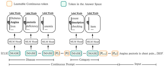 Here, we still take the disease “ ” and category “” as an example. As shown in Figure 5, the template and label word set can be formalized as follows: