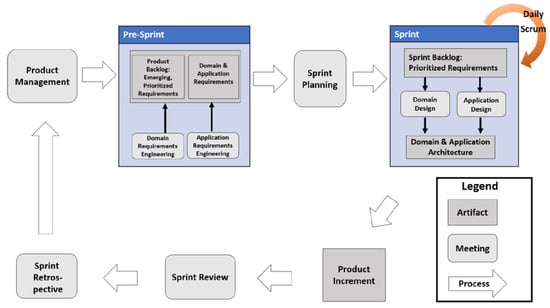 In the Pre-Sprint, we adopt the same domain requirement engineering approach as SPLE and also deal with the application engineering requirements of specific products [8,9,10,11]. In SPLE, the domain and application engineering process sequence has no particular direction or restriction [43]. The incremental method develops common domain products and then develops variability products based on specific customer needs in application engineering. The domain and application requirements engineering sub-processes can improve the traceability management of Scrum in requirement analysis, requirement changes, and related documents.