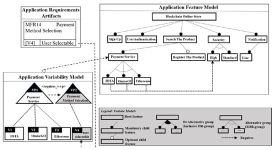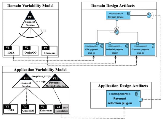 Next, this study identifies the parts that belong to the variation points in the model and uses the domain variability model to describe the parts of the variation more clearly. The domain variability model elucidates the dependencies among the variables through the dependency link. Figure 4 depicts a triangle as a variation point named “payment service” and relationships with three variations, namely IOTA, OmiseGO, and Ethereum, represented by rectangles. The dashed line between the variation point and the variation represents an optional correlation. In contrast, solid lines denote mandatory dependencies, implying that the corresponding variables must be selected. The model is also indicated by an arc marked with the reference amount of [1..1], and only one of the three variables must be selected.
