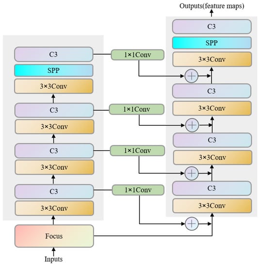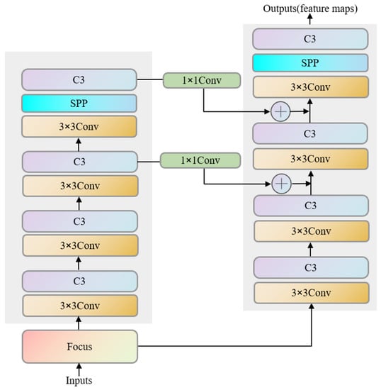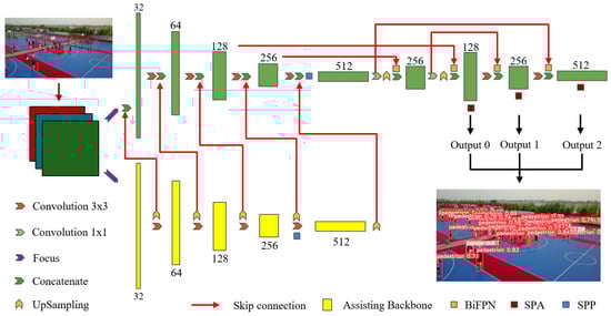 As shown in Figure 3, after the 80 × 80 feature image obtained by convolution in the assisting CSPDarknet53 backbone is input to the main backbone, it is superimposed and fused with the feature image obtained after the 640 × 640 original image is processed by Focus slicing, and the obtained result is input as the input content to the starting position of the main backbone. The 40 × 40 feature image obtained by convolution processing in the assisting backbone model and the 80 × 80 feature image in the main backbone model are then superimposed and fused, and the result is used as the input to continue the next convolution process. Finally, the 20 × 20 feature image output by the assisting backbone is superimposed and fused with the 40 × 40 feature image in the main backbone model, and the result is input to the main backbone model to continue the convolution operation. Thus, the obtained feature image is passed to the next module. After that, the feature information extracted from the backbone network is used as the input in Section 3.3 to perform multi-scale stacking and processing of features through the bidirectional feature pyramid network. Using the features learned by the network, combined with the spatial pyramid attention mechanism in Section 3.4, the objects in the input images of the model are classified and localized.