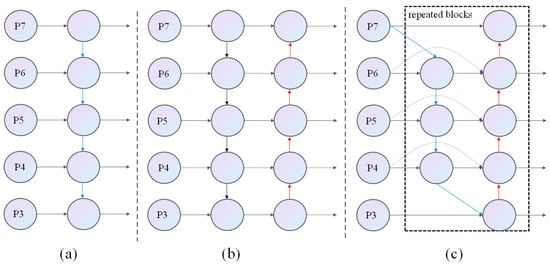 Comparison among different feature extraction modules. (a) Top-down FPN structure; (b) top-down and bottom-up PANET structure; (c) BiFPN structure with bidirectional path.