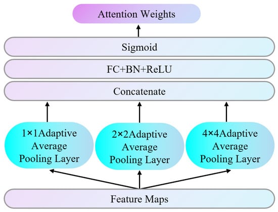 Among them, represents the fully connected layer; sigmoid(∙) represents the activation function layer; , and represent the 1 × 1, 2 × 2, and 4 × 4 adaptive average pooling layers, respectively; and represents the output weight. The spatial pyramid attention mechanism locates the information of interest by using the structure of the spatial pyramid instead of global average pooling, which consists of two parts. As shown in Figure 6, the input feature maps are passed through a spatial pyramid structure, which is adaptively average pooled at three scales, to generate attention maps. Among them, the purpose of the 1 × 1 adaptive average pooling layer is to obtain the key information of the category in the feature map, the 2 × 2 pooling layer is used to save the less important key feature information in the image, and the 4 × 4 average pooling can effectively obtain the key position information in the feature map. Afterwards, the generated attention map is passed through a weight module, which is composed of a fully connected layer and a sigmoid activation layer, to generate the attention weights in the corresponding feature map. Thus, through the attention weight output by the attention module, the small objects in the original image are more accurately marked.