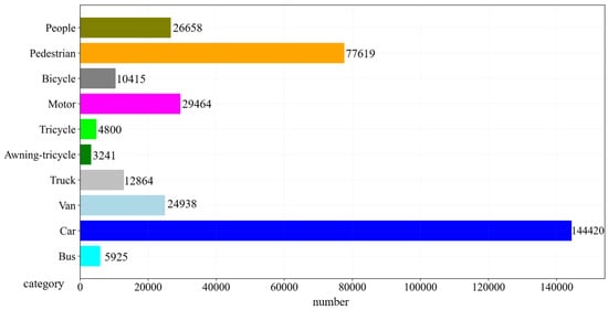 The data selected for the experiments were from the VisDrone-DET dataset. This dataset was collected by the AISKYEYE team at the Machine Learning and Data Mining Laboratory of Tianjin University, China. The dataset consisted of 10,209 still images captured by various drone-mounted cameras, including different locations (taken from 14 different cities that were thousands of kilometers apart in China), different environments (urban and rural), different objects (pedestrians, vehicles, bicycles, etc.), and different densities (sparse and crowded scenes). There were mainly 10 categories of objects. The number of samples for each category is shown in Figure 7.
