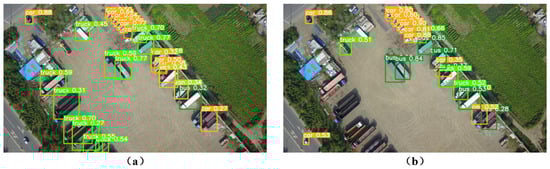 Schematic diagram of the detection results of two backbone networks (a) and three backbone networks (b) in the composite backbone network. From the comparison of the two figures, the number of targets detected in (b) is significantly less than in (a), which proves that the effect of the two backbone networks in the composite backbone network is better than that of the three backbone networks.