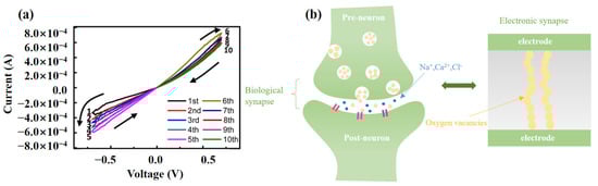 - Song, W.; Yu, H.; Li, X.; Fang, R.; Zhu, W.; Zhang, L. Electric-Controlled Resistive Switching and Different Synaptic Behaviors in P+-Si/n-ZnO Heterojunction Memristor. IEEE Trans. Electron Devices 2023, 70, 1648–1652. [Google Scholar] [CrossRef]