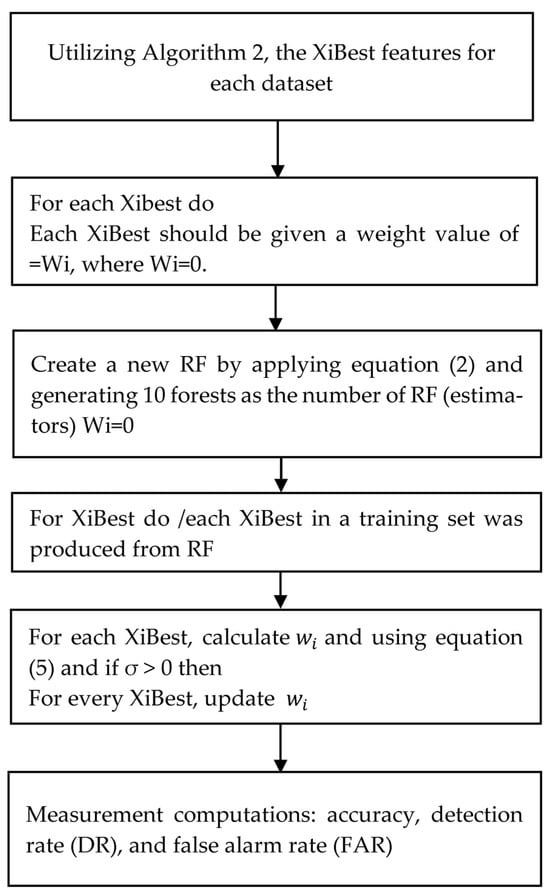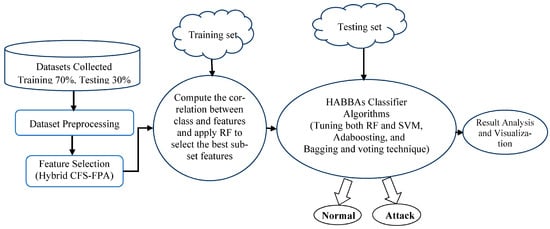 The filtered data is then moved on to the next stage, where the method known as CFS-RF is used only to choose the affected features for the outcomes. In order to distinguish between legitimate activity and potential attacks, the system employs the reimplemented hybrid adaboosting bagging algorithms (HABBAs) as classifiers. The system’s intricate construction is shown in Figure 2.