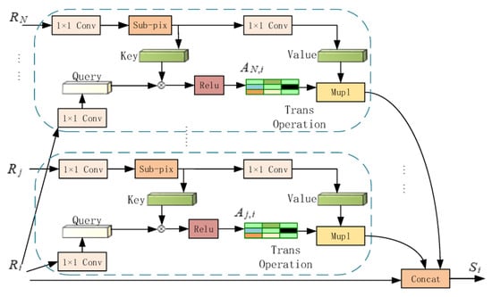 The Trans operation is presented in the dashed box in Figure 4, which shows that first, a 1 × 1 convolution and up-sampling are performed on to transform it into as a key with the same resolution as . Next, is transformed into as a query using a 1 × 1 convolution. Then, the dot product is used to calculate the similarity between the elements of and , and the result is processed by the function to obtain . The scale of is jointly determined by the size values of and . As the network depth increases, contains larger receptive fields and more occlusion clues. Therefore, as the value of increases, the size of decreases. Finally, the dot product of and provides , where is obtained by performing two consecutive 1 × 1 convolution and sub-pixel operations on .