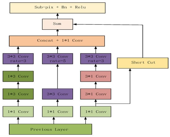 Owing to the reasoning of occlusion relationships between different objects, accurate order prediction of the foreground and background regions is required. Therefore, an embedded receptive field enhancement module we designed is implemented into the network structure to perceive information on object edges. Inspired by the work presented in [31], we propose the MRFB. The MRFB structure includes several parts: a multibranch convolution layer using different convolution kernels, a dilation convolution layer at the end of each branch (used to form constraints between the contour pixels), and a shortcut branch, as shown in Figure 5.