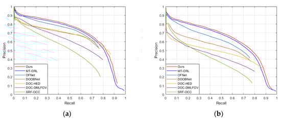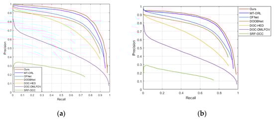 The precision-recall curves of different methods in the contour extraction and occlusion orientation prediction tasks on the PIOD dataset are shown in Figure 7a and Figure 7b, respectively. The results show that the proposed method achieved significant improvements in both precision and recall compared with the other methods. The experimental results of the ODS, OIS, and AP metrics of different methods are presented in Table 3, which shows that the proposed method outperformed the MT-ORL method. Furthermore, the proposed method achieved the shortest running time and the highest efficiency (34.6 FPS) on the PIOD test set.