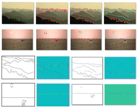 When capturing object projections from a 3D scene in a 2D image, the occlusion boundaries of objects satisfy the depth discontinuities between different objects (or the object and background). Therefore, analysis of the occlusion relationship between objects from monocular images can reveal the relative depth differences between objects in the scene. Figure 1 shows an example from the BSDS300, in which two deer obstruct the lawn; their boundaries are considered occlusion edges, while their shadows are not. This method of inferring occlusion relationships between different objects from a monocular 2D image has been widely applied in many fields, including visual tracking [1,2], mobile robotics [3,4], object detection [5,6,7,8], and segmentation [9,10,11].