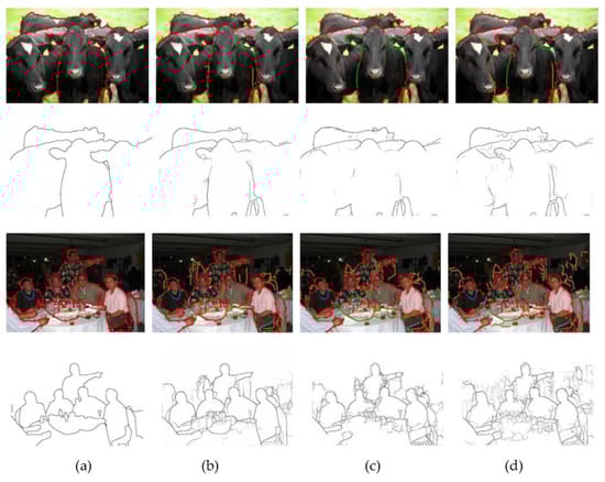 Finally, the contour and occlusion relationship maps were constructed. The results of the experiments on multiple images from the BSDS and PIOD datasets show that the contours extracted by the proposed method were more complete and clearer than those of the DOOBNet [19] and MT-ORL [21] methods, as shown in Figure 8 and Figure 9. In addition, as shown in Figure 8, in a large area of the solid-colored scene, the proposed method had a sufficient receptive field, as opposed to a small receptive field, making it difficult to perceive a large area of solid-colored objects and correctly predict this relationship. Furthermore, many foreground objects appeared in the scene, and the edge occlusion relationships were complex and difficult to distinguish, as shown in Figure 9. However, the proposed method could accurately detect the occluded edges, showing stronger generalization potential compared with the other methods.