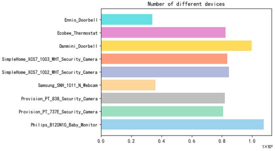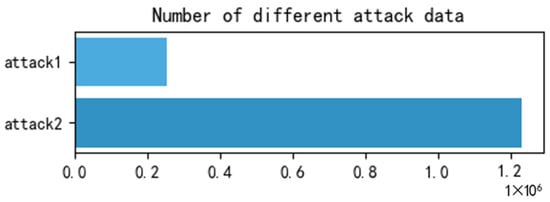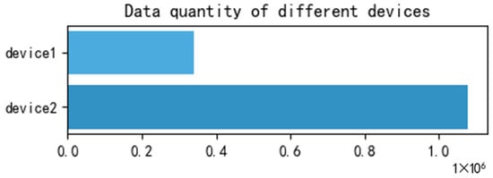 Smart home devices differ in functionality and operational characteristics, exhibiting distinct working hours and data throughput. Attackers take various factors into account, such as device usage frequency and attack complexity, when exploiting vulnerabilities in different types of devices. This leads to the devices being subjected to varying frequencies of network attacks. The N-BaIoT dataset [28] of typical IoT devices shows the variance in data throughput and traffic collected among different devices. As depicted in Figure 2, a smart doorbell device (device1) and a smart camera device (device2) exhibit different data throughput, with device1 having a lower data throughput. Consequently, the amount of data collected by device1 is significantly less than that collected by device2 (338,599 vs. 1,075,936). Moreover, the number of data points generated by different attack behaviors also varies based on the attack frequencies of the devices. For instance, Figure 3 shows that attack1 (a UDP attack by the Gafgyt botnet) and attack2 (a UDP attack by the Mirai botnet) both utilize vulnerabilities to carry out DDoS attacks. However, attack2 is more effective and straightforward, resulting in a higher frequency of occurrence. Therefore, attack1 has far fewer data samples (255,111 vs. 1,229,999).