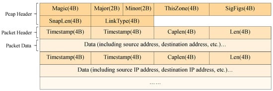 In Section 3.1, it was discussed that various smart home devices exhibit differing data throughput and attack frequencies. Once the traffic data from these devices is captured, it is typically stored in a pcap file format. The format of the pcap file is shown in Figure 5. While the pcap file contains information such as timestamps, source addresses, and destination addresses, it lacks the ability to indicate device and data classes, resulting in the inability to label traffic. As a result, intrusion detection models that utilize supervised learning methods cannot directly utilize this data for training purposes. This challenge is also present in the N-BaIoT standard dataset, which includes eleven types of data collected from nine types of IoT devices (including one type of normal data and ten types of attack data). The dataset fails to provide feature columns that indicate the device class of each sample and distinguish the data class. To address the challenge of being unable to use raw data for training intrusion detection models and to improve data quality, this study proposes the EM-FEDE method’s feature enhancement module. This module achieves feature enhancement through R analysis, feature-adaptive expansion, and data cleaning, thereby optimizing the data and indicating missing class features.