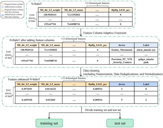 Step 2. The N-BaIoT dataset contains prior knowledge E that enables us to determine the device class and data class of the dataset. Based on Equations (2) and (3), we added feature columns “device” and “Label”. Data1 corresponds to mirai_attacks syn attacks on the Ecobee_Thermostat device. As a result, we obtain data1′ = {138.9020131, 72.11292822, …, 0,”Ecobee_Thermostat”,”mirai_attacks syn”};