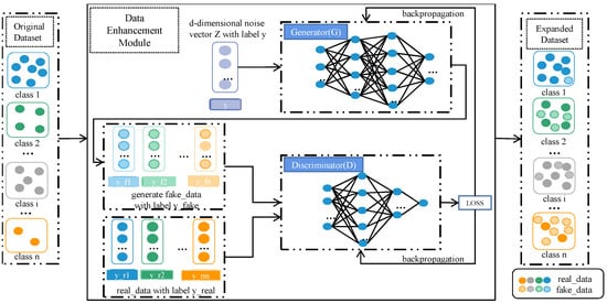 In recent years, more and more research has applied GAN for data enhancement to improve the performance and robustness of machine learning models. In 2021, the authors of [23] proposed using the ACGAN model to solve the problem of the imbalanced distribution of 1D intrusion detection sample data, which improved the average detection accuracy of some classification models. In 2021, the authors of [24] proposed an improved DCGAN model with higher stability and sample balance to achieve higher classification accuracy for a few samples. In 2022, the authors of [25] proposed a new generation of methods that use a class of classification models to determine the authenticity of facial images. This method improves cross-domain detection efficiency while maintaining source-domain accuracy. In 2023, the authors of [26] proposed an attention-self-supervised learning-aided classifier generative adversarial network algorithm to expand the samples to improve the defect recognition ability of small sample data sets. In 2023, the authors of [27] proposed a generative model for generating virtual marker samples by combining supervised variational automatic encoders with Wasserstein GAN with a gradient penalty. This model can significantly improve the prediction accuracy of soft sensor models for small-sample problems.
