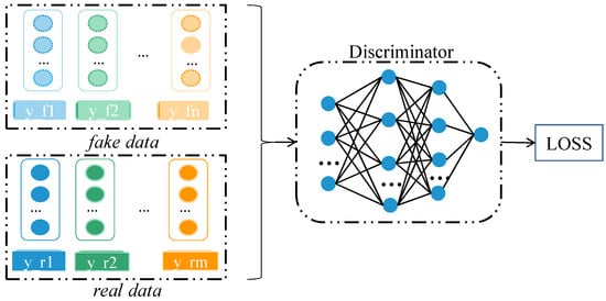 Step 2. Training the discriminator. The process of training the discriminator is illustrated in Figure 8. It involves inputting a set of randomly generated fake_data samples and real_data samples of sizes n and m, respectively, into the discriminator. The loss values of both sets of data are computed using Equation (9) and subsequently used to update the discriminator’s parameters: