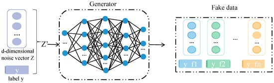 Step 3. Training the generator. The process of training the generator is illustrated in Figure 9. The generator is trained by generating a d-dimensional noise vector Z with label y as input, producing a set of fake_data samples of size n. These fake_data samples, along with the real_data samples, are then input into the discriminator. The loss value for this set of fake_data is computed using Equation (10), and the generator’s parameters are updated accordingly.