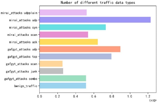 The N-BaIoT dataset, released in 2018, consists of network traffic samples extracted from nine real IoT devices, featuring normal traffic from these devices and five varieties of attack traffic from the gafgyt and mirai botnet families. Figure 10 and Figure 11 illustrate the differences in the data distribution across different traffic types and devices.